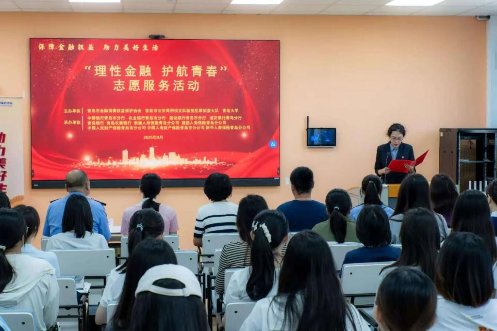 金融教育宣传周到来之际,为进一步普及金融知识,提升大学生金融风险防范意识,9月18日,由青岛市金融消费权益保护协会联合青岛市公安局刑侦支队新型犯罪侦查大队、青岛大学经济学院共同主办的”金融知识进大学“主题宣传活动在青岛大学金家岭校区西院三号实验楼423教室成功举办,经济学院党委副书记于文洁、团委书记戴俊杰、学工办主任任龙、辅导员程漫漫、周晓彤出席本次活动。活动特邀国家金融监督管理总局青岛监管局一级调研员、青岛市金融消费权益保护协会专职副会长王芹、青岛市金融消费权益保护协会副秘书长肖珍凤、青岛市公安局刑侦支队新型犯罪侦查大队四级高级警长杨文志参加。