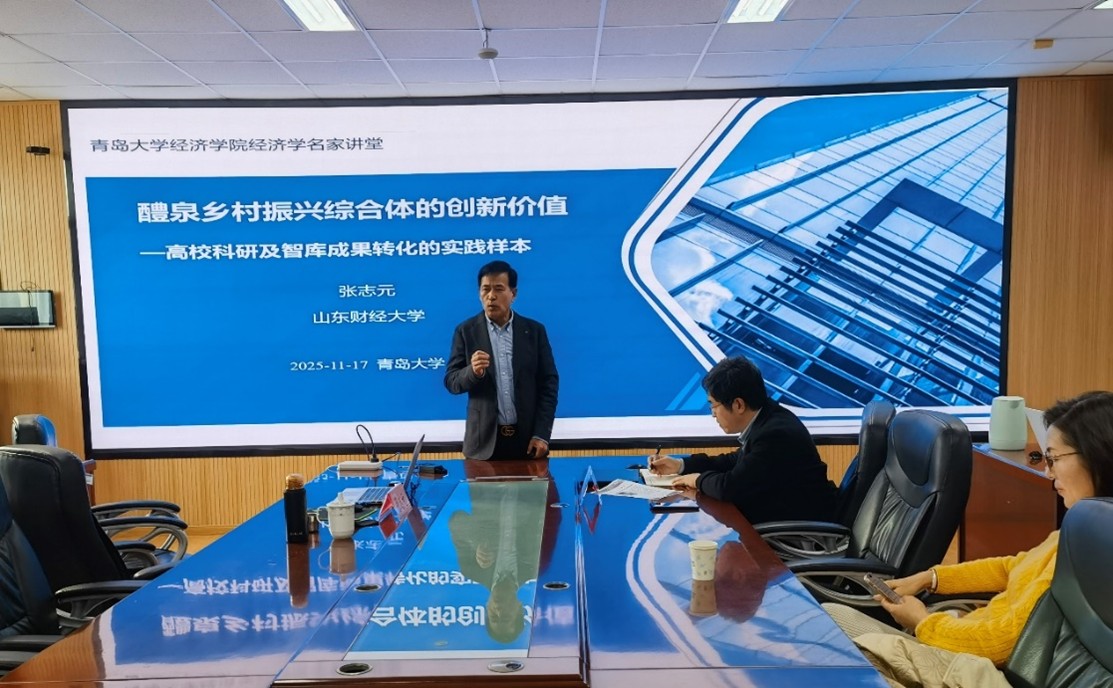 2025年11月17日下午,青岛大学经济学院“名家讲堂”在金家岭校区西院3号实验楼307会议室举行。讲座由经济学院院长吕学梁主持,由山东财经大学资深教授、博士生导师张志元以“醴泉乡村振兴综合体的创新价值——高校科研及智库成果转化的实践样本”为题,给大家带来了一场兼具理论深度与实践温度的学术讲座。