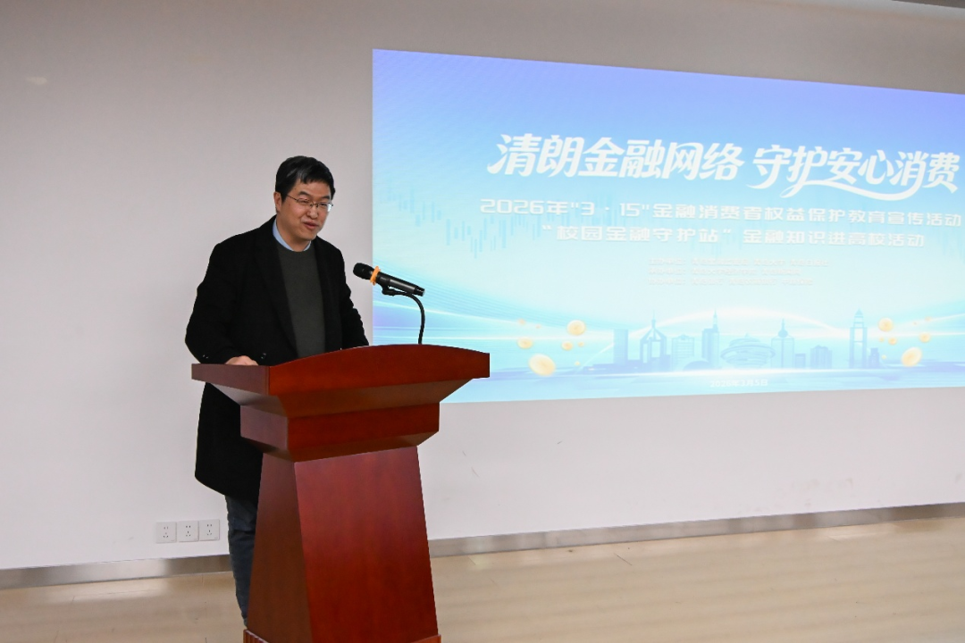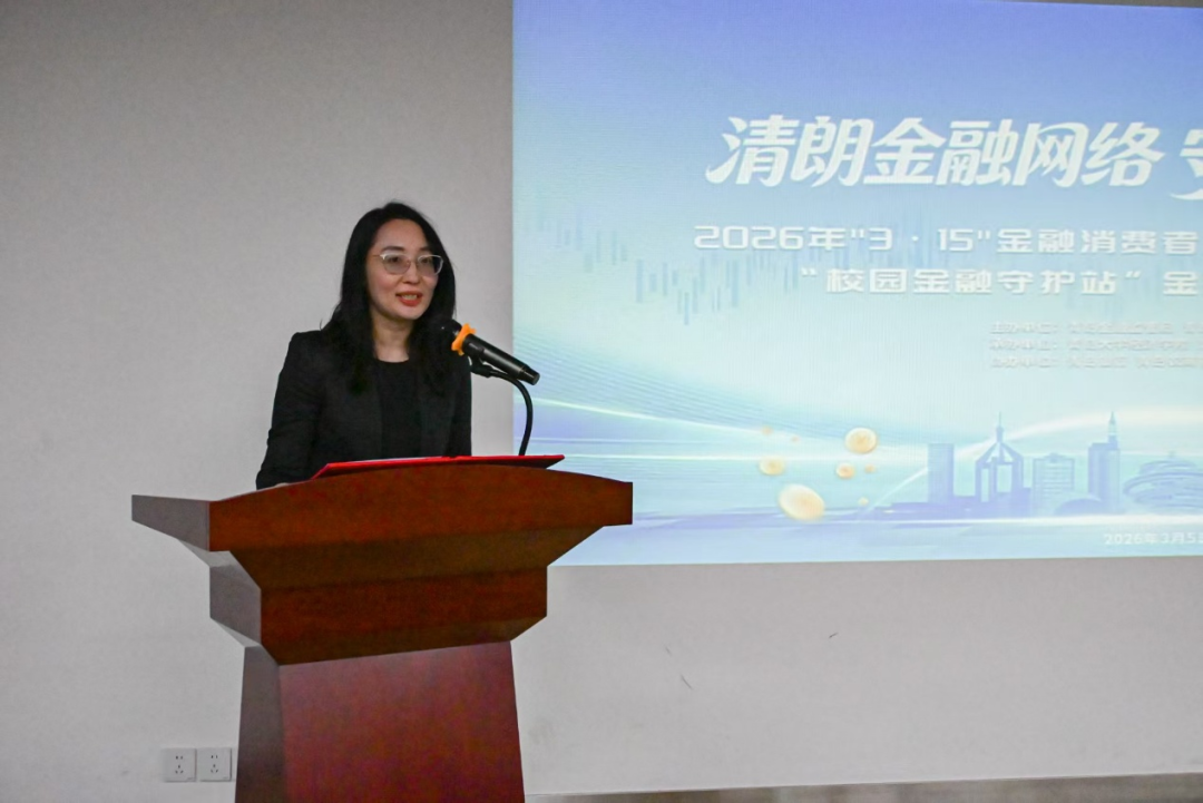 张弘致辞,她结合当前金融行业发展新形势、新特征与新要求,深刻剖析了新时代背景下金融知识普及教育的重要意义与时代价值,围绕金融风险防范、专业能力提升与青年职业发展方向等关键内容展开阐述。她鼓励广大青年学生主动树立金融安全防范意识,立足专业学习夯实理论基础与实践能力,不断提升自身金融素养与风险识别能力。同时,她呼吁同学们主动关注、学习金融知识与防诈技能,自觉守护自身财产安全与合法权益,并对青年学子成长成才、未来投身金融领域高质量发展寄予殷切期望与美好祝福。